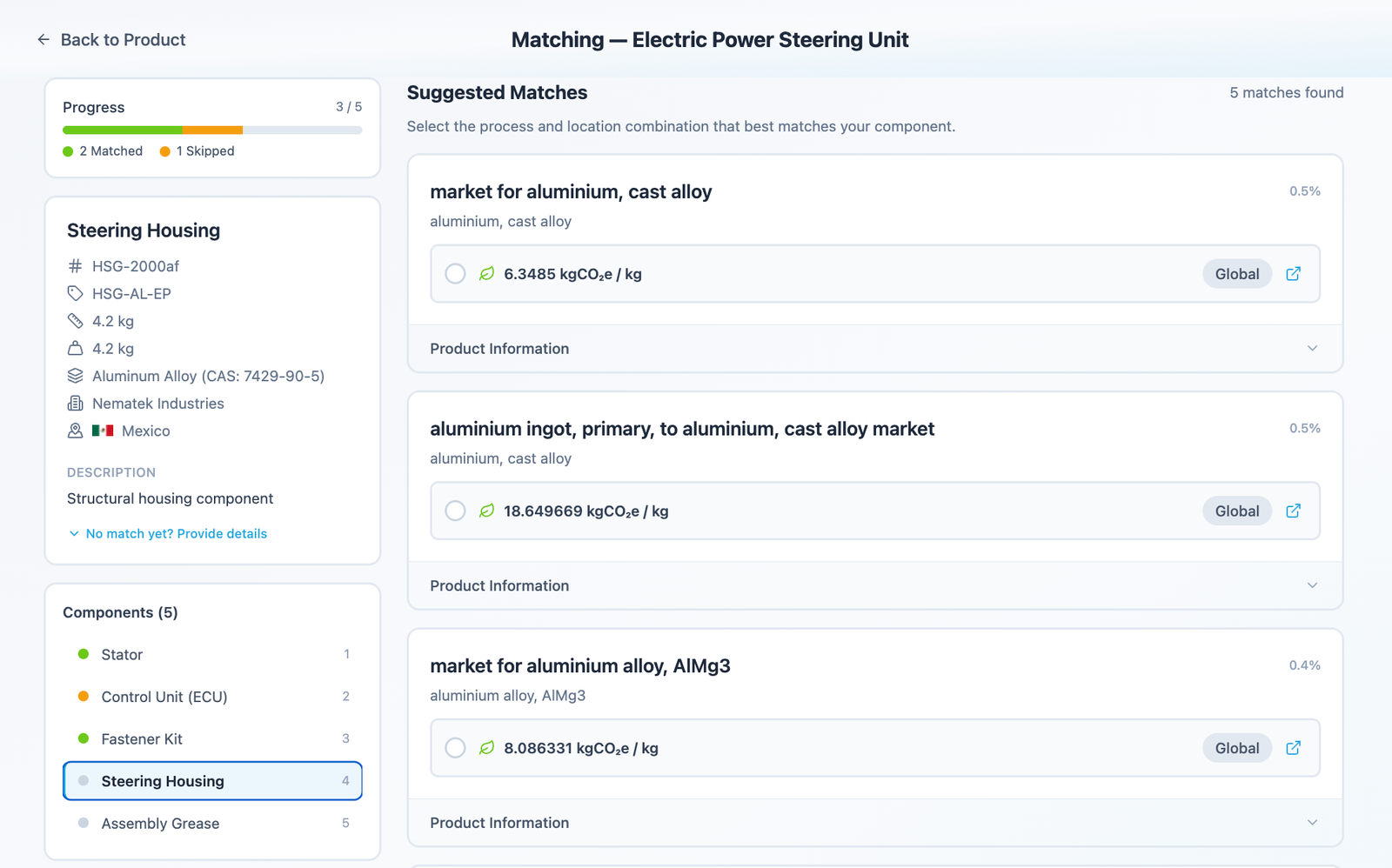 One thing worth flagging separately: the repetition problem. The same polypropylene bracket appears in 15 products across your portfolio. In a manual workflow, that’s 15 separate matching decisions, often made by different people on different days, sometimes landing on different answers. A component library solves this. Once a match is confirmed, it’s stored and reused across every subsequent product automatically. By the time you’re calculating your 20th PCF, the library is doing most of the work.